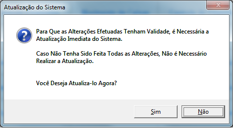 Após qualquer alteração que seja feita nos itens do cadastro de operações, a opção “atualizar modificações das operações” deverá ser selecionada para que as alterações fiquem disponíveis para todos os terminais atualizarem. Quando é feita alguma modificação nestes itens, elas são gravadas em um arquivo temporário no micro em que é feita, e só será atualizada no servidor quando for selecionada esta opção de atualização. Uma tela de confirmação aparecerá, igual a figura abaixo.