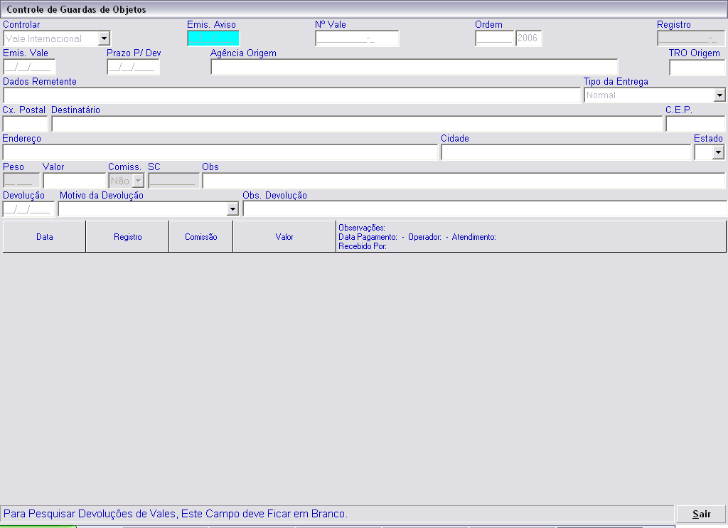 Prazo p/ devolução: É a data limite para guarda do vale na agência. Se este não for preenchido, a data atual mais 60 dias é automaticamente colocada. O sistema irá considera esta data para devolução do mesmo.