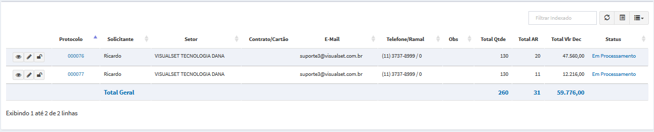Importante: É possível editar os protocolos que ainda estiverem com status “em Processamento”, caso já tenha sido fechado não será possível fazer nenhuma alteração. Os botões de inclusão e alteração ficarão inativos.